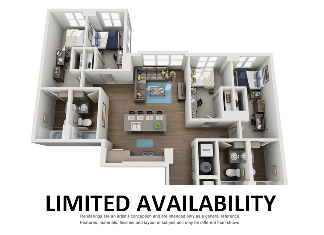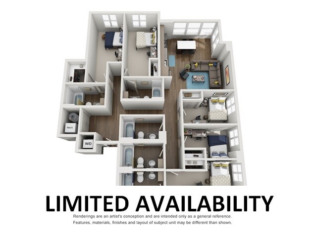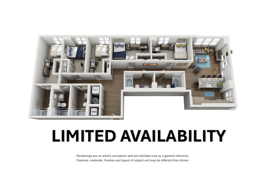 - 4 Bedrooms- 4 Bedroom 4 Bathroom C- From $1,6494 Beds, 4 Baths, 1199 sq ftAvailable Now- Model Gallery- Floorplans- Availability Details- Price - Availability Date - Unit - Sq Ft - From $1,649 - Available Now - 4 Bedroom 4 Bathroom C - 1199 sq ft - Model Amenities and Features- Features- Air Conditioning