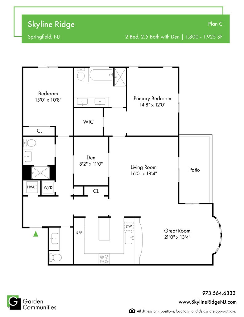 Skyline Ridge is a collection of 93 residences perched on a hillside site that overlooks the ever changing Manhattan skyline in the Union County Town of Springfield, N.J. The luxury rental community features six housing layouts ranging in size from 1,440 to 2,200 square feet of luxury living space. Each spacious two bedroom unit includes a gourmet kitchen with GE appliances, Caesar Stone counter tops, living and dining room (per plan), master suite with expansive walk-in closet, sumptuous bath with Jacuzzi tub and separate shower, private balcony and secure indoor parking with keyed storage space. Residents at Skyline Ridge also enjoy recreational amenities and services, including a state-of-the art fitness center, Club Room and the convenience of a 24-hour concierge service. Don't miss out on our spacious apartments, provide the perfect space for a home office or children's play area.
