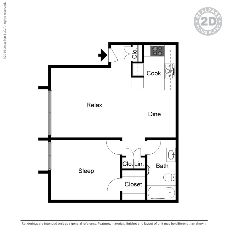 Large 1 Bed 1 Bath - Floorplan 2 Floor plans are artist's rendering. All dimensions are approximate. Actual product and specifications may vary in dimension or detail. Not all features are available in every rental home. Prices and availability are subject to change. Base rent is based on monthly frequency. Additional fees may apply, such as but not limited to package delivery, trash, water, amenities, etc. Deposits vary. Please see a representative for details.