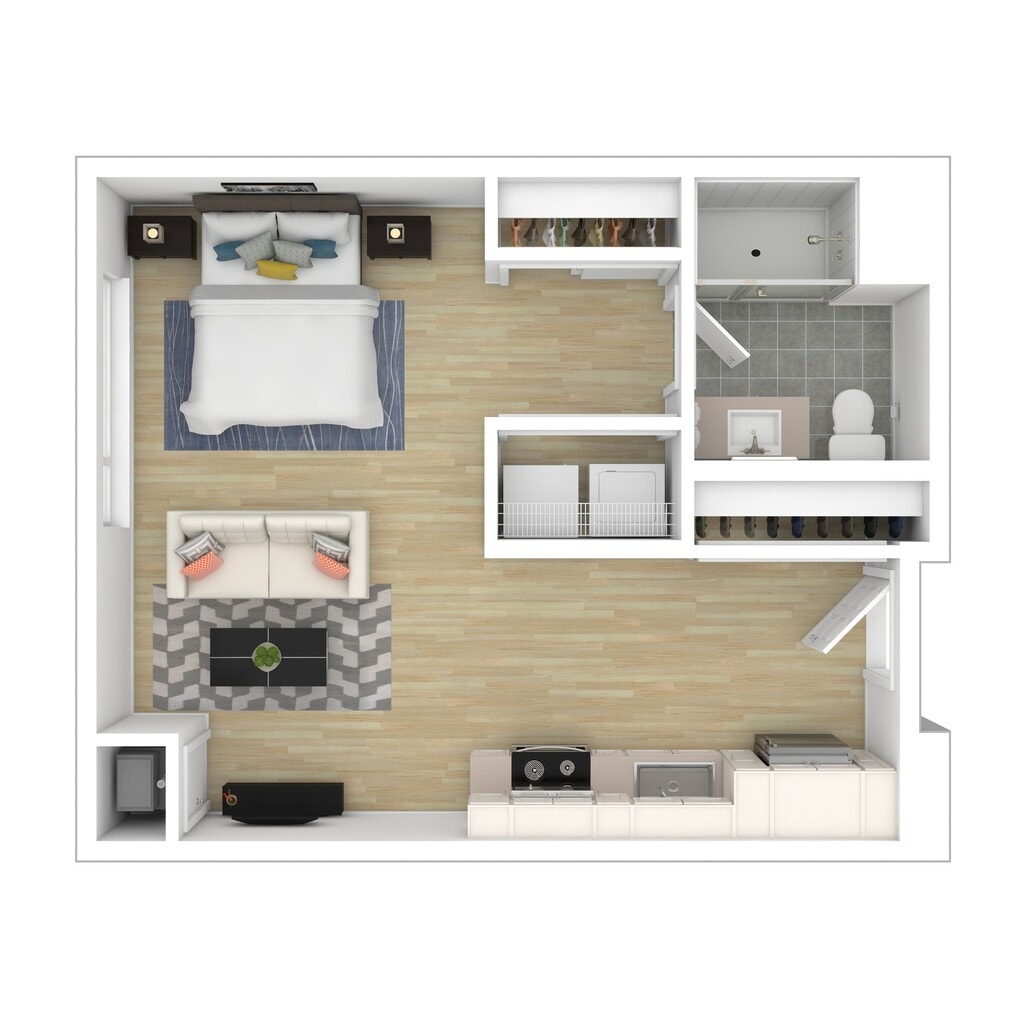 Apartment Model: S1 - AFFORDABLEFrom $1,479Studio, 1 Bath, 525 sq ftAvailable February 2, 2026Floor plans are artist's rendering. All dimensions are approximate. Actual product and specifications may vary in dimension or detail. Not all features are available in every rental home. Prices and availability are subject to change. Base rent is based on monthly frequency. Additional fees may apply, such as but not limited to package delivery, trash, water, amenities, etc. Deposits vary. Please see a representative for details.