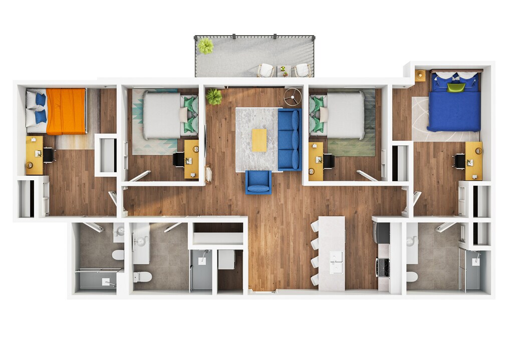 3x3 - Floorplan 1 Apartment Unit: PrimaryApartment Model: 3x3$1,5603 Bedroom, 3 Bath, 1149 sq ftAvailable August 15, 2026Apartment Unit: PrivateApartment Model: 3x3$1,5153 Bedroom, 3 Bath, 1149 sq ftAvailable August 15, 20264 Bedrooms