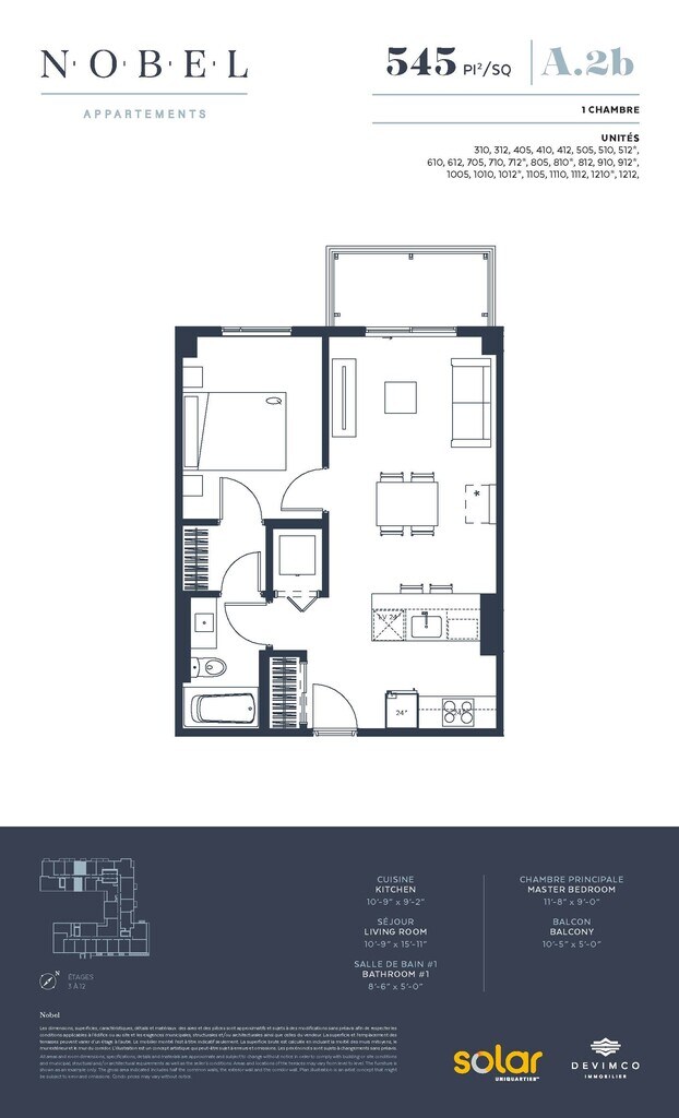 Experience the ultimate lifestyle at Solar Uniquartier in Brossard, close to numerous shops and the REM. **CURRENT PROMOTION:** Up to 2 months of free rent – certain conditions apply. All-inclusive package: • Six appliances (fridge, stove, dishwasher, microwave, washer, and dryer) • High-speed internet • Electricity • Heating and air conditioning Indoor parking spaces ($140/month) and storage lockers ($35/month) are also available for rent. Nobel Apartments offers a variety of common areas: • Swimming pool • Terrace • Barbecue • Gym • Elevator • Video surveillance • And much more ***Floor plans, descriptions, and photos are for reference only and may vary depending on the available apartment types.***