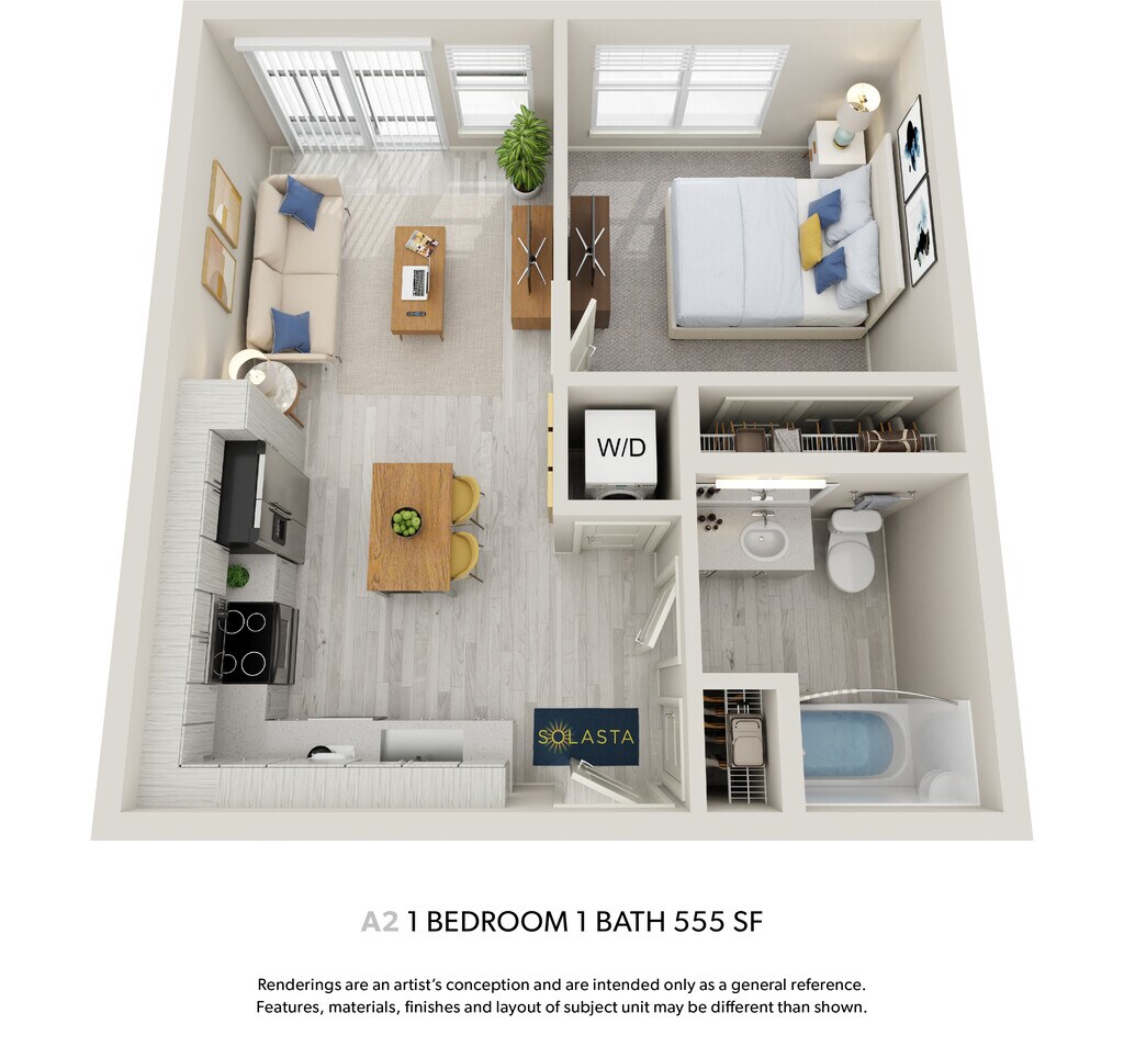 A2 - Floorplan 2 Apartment Unit: 2412Apartment Model: A21 Bedroom, 1 Bath, 555 sq ftAvailable NowApartment Unit: 3402Apartment Model: A21 Bedroom, 1 Bath, 555 sq ftAvailable December 6, 2025Floorplan A1