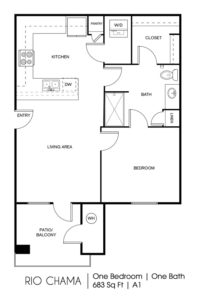 Apartment Model: Rio ChamaFrom $1,5031 Bedroom, 1 Bath, 683 sq ftAvailable NowFloor plans are artist's rendering. All dimensions are approximate. Actual product and specifications may vary in dimension or detail. Not all features are available in every rental home. Prices and availability are subject to change. Base rent is based on monthly frequency. Additional fees may apply, such as but not limited to package delivery, trash, water, amenities, etc. Deposits vary. Please see a representative for details.