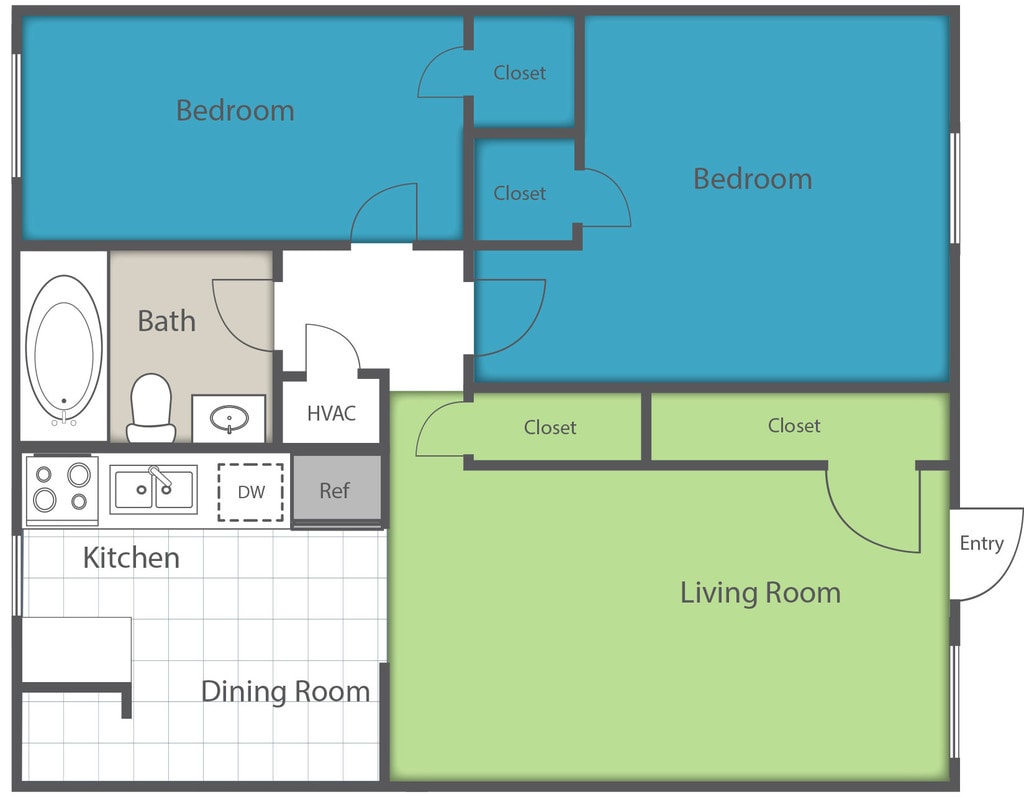 2 Beds, 1 Bath, 754 sq ftAvailable NowModel Gallery