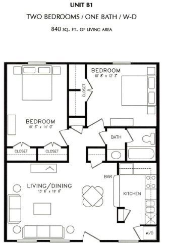 Availability Date Unit Sq Ft Unavailable B1 840 sq ft Apartment Model: B12 Bedroom, 1 Bath, 840 sq ftUnavailableFloorplansPhotos![]()