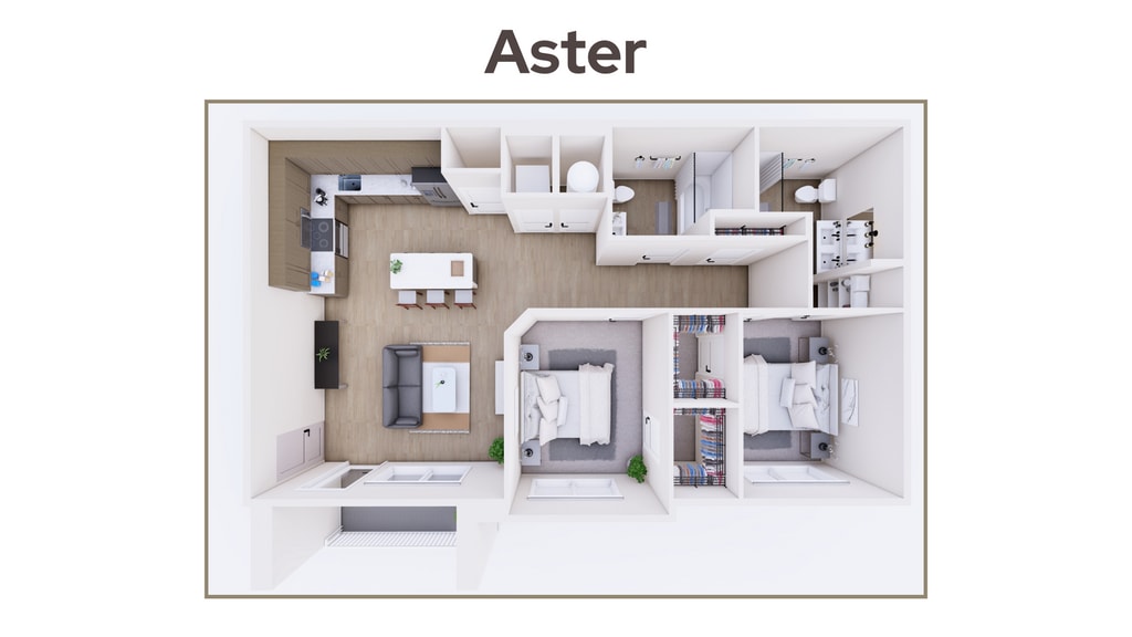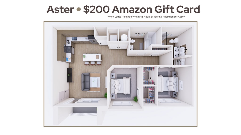 - 2 Bedrooms- Aster- $1,6502 Beds, 2 Baths, 962 sq ftAvailable Now- Model Gallery- Floorplans- Photos- Availability Details- Price - Availability Date - Unit - Sq Ft - Deposit - View Details - $1,650 - Available Now - 4-207 - 962 - $1,650 - $1,650 - January 7, 2026 - 1-302 - 962 - $1,650 - Model Amenities and Features- Features- Air Conditioning