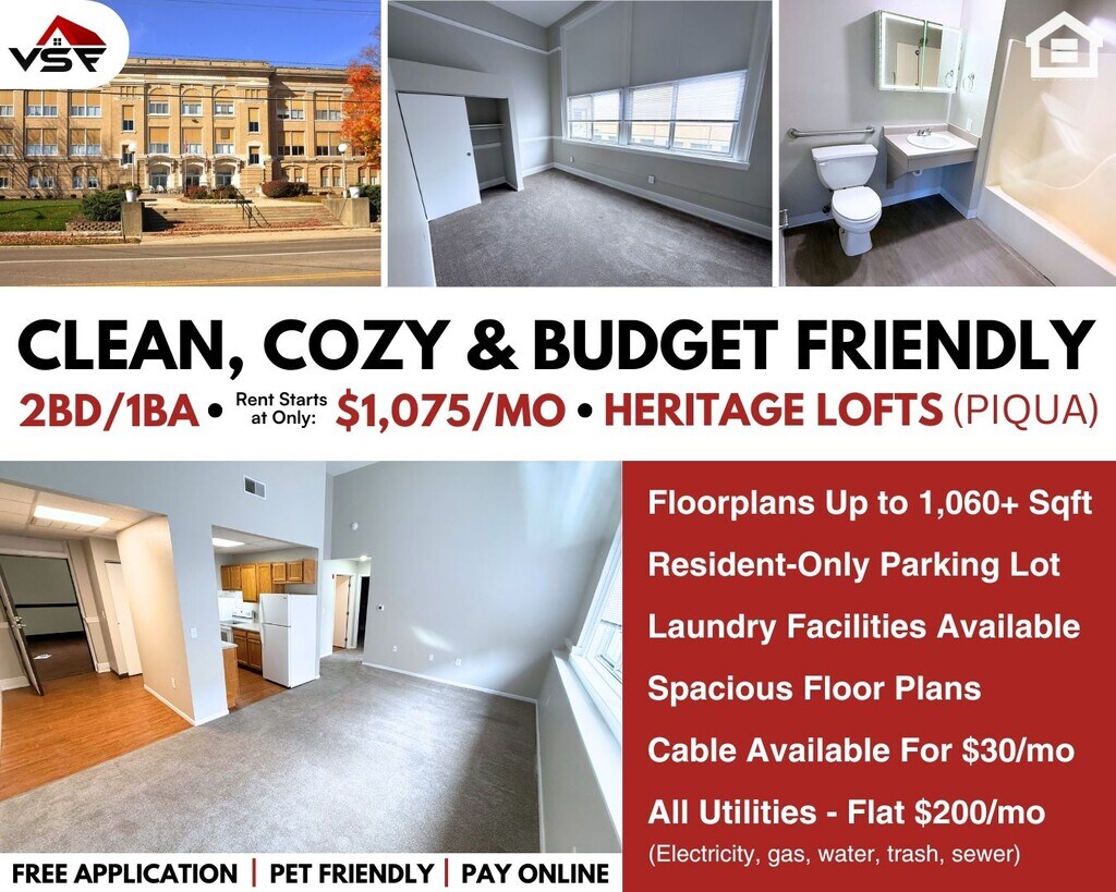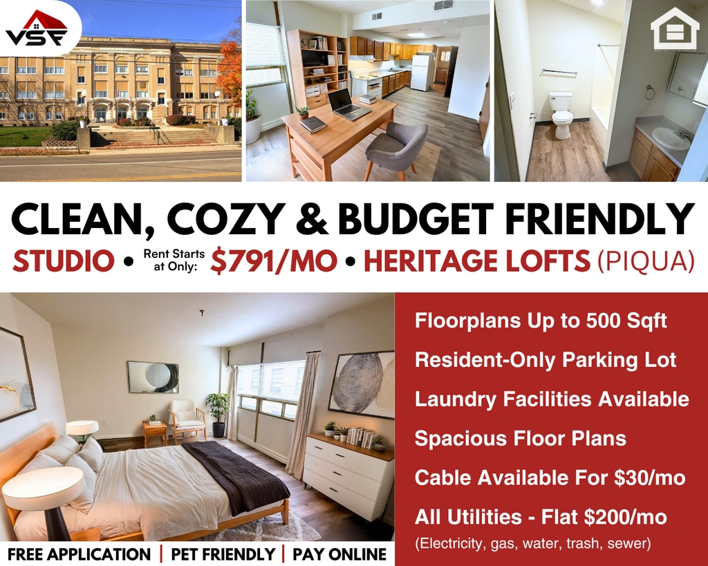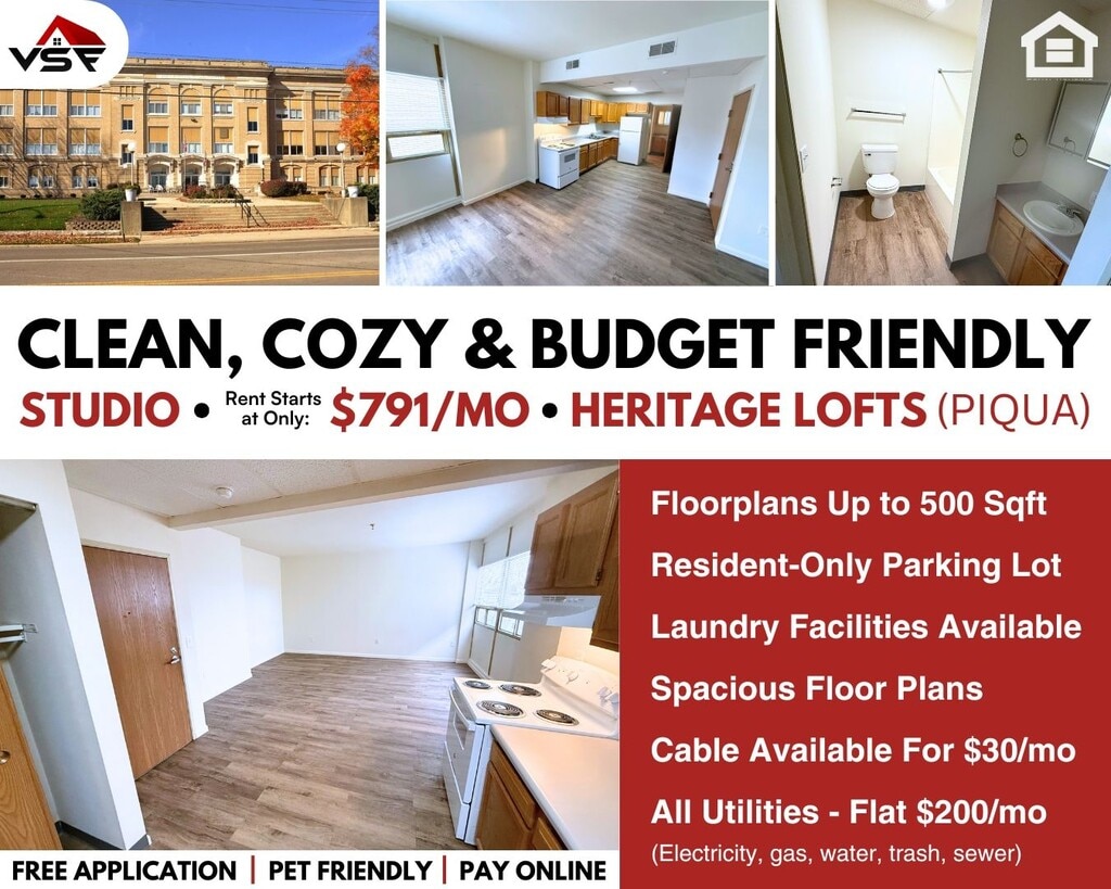 Price: Starting at only $791/month Utilities: Flat Fee of $200/mo (gas, electricity, water, trash, sewer) Available Apartments: Studio, 1 BD / 1 BA, 2BD / 1 BA Size: Up to 1,060+ Sqft of Living Space **Features:** On-Site Laundry Facilities High-Speed Internet & Cable-Ready Air Conditioning & Heating Smoke-Free Environment Handicap Accessible Units Fast Maintenance & Repairs 24/7 Support **Description:** Welcome to Heritage Lofts, located in the heart of Piqua, OH. Our thoughtfully designed studio, 1-bedroom and 2-bedroom apartments start at just $791/month (+ $200 Flat Utility Fee). Enjoy a spacious living space designed for ease and convenience. Under new management, our team is dedicated to upgrading your living experience. Residents enjoy a range of amenities, including on-site laundry facilities, a secured entryway for added safety, and the option for cable and high-speed internet. The flat $200 utility fee covers gas, electricity, water, trash, and sewer, making budgeting simple and stress-free. ** Income Restrictions Apply** This property is a part of the Low-Income Housing Tax Credit (LIHTC) program, which means there are income limits to qualify for residency. This ensures that the housing remains affordable for those who meet specific income criteria, providing a high-quality living environment at a reduced cost. Handicap units are also available upon request. **Pet-Friendly** This property is pet-friendly. One-time $300 fee per pet and $35/mo per pet thereafter. 2 pet limit. **Application and Eligibility:** Free Application: There is a $0 application fee when applying before or the same day of your tour. Click “Apply Now” to lock in this offer. Metro-approved unit - please ask for more information **Scheduling a Tour:** Interested in seeing our apartments? Schedule a tour today by clicking “Request a Tour” or “Contact Us”. Alternatively, you can call / text: or email