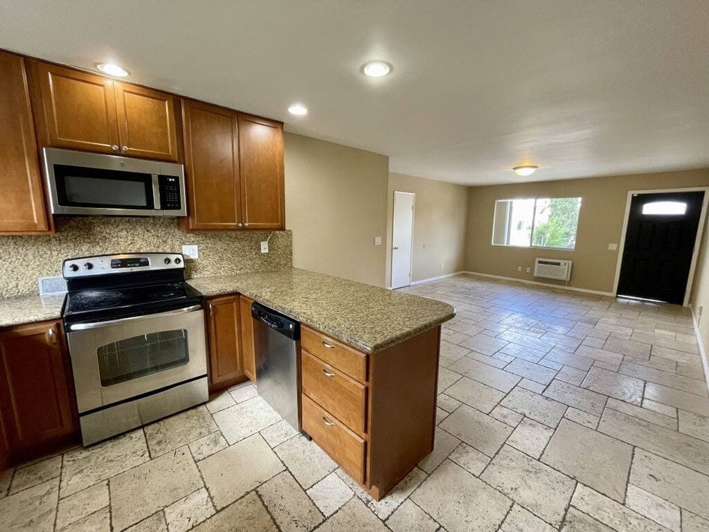Unit provide a very spacious open floor plan. Travertine flooring through out kitchen and living room and remodeled. Includes newer stainless steel refrigerator, stove, dishwasher, microhood. Granite counter tops and beautiful newer cabinets in kitchen and bathroom.Assigned Parking with additional close off-street parking. Tenant pays all utilities. No pets. Laundry Facility onsite. CABRE 01197438 All applicants must complete a PetScreening profile even if the household does not have a pet/animal. Please see the link below or contact the office.