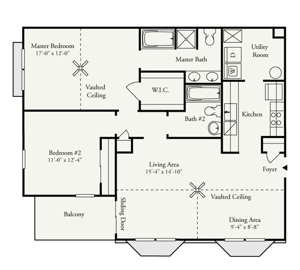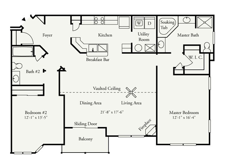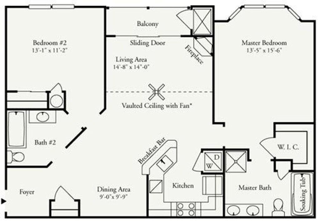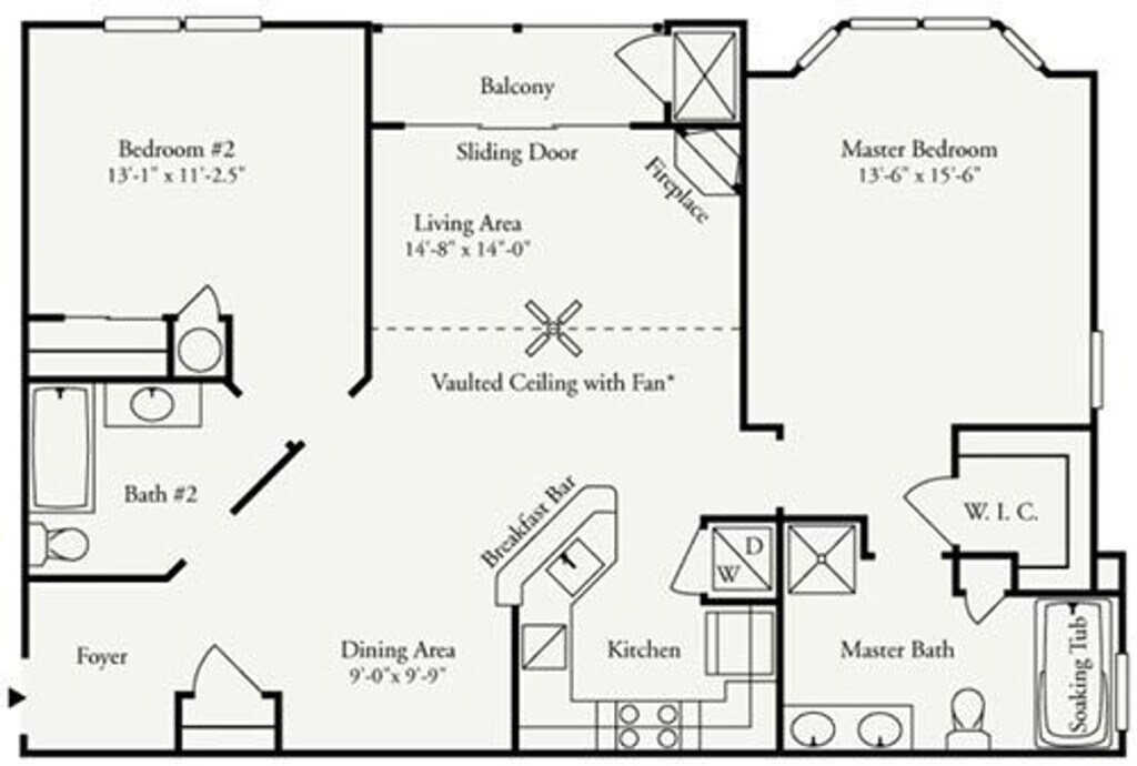 This beautiful two-bedroom, two-bathroom apartment consists of 1,159 sq. ft. of living space and is located on the second floor. The galley-style kitchen with granite countertops provides nice separation from your living areas. The dining and living rooms feature beautiful half-moon windows, vaulted ceilings, and ceiling fans. The large Master bedroom includes a spacious walk-in closet, and direct access to the master bathroom, which offers a shower stall, soaking tub, and double vanity. This layout will feature granite counters in the kitchen and luxury vinyl tile (LVT) flooring in all living areas, which is specifically designed to look like hardwood flooring, for a timeless and elegant look. This layout requires area rugs to cover 80% of the LVT flooring. Maximum occupancy for this layout is 4 total occupants. *Rental Rate quoted is subject to change based upon lease term.