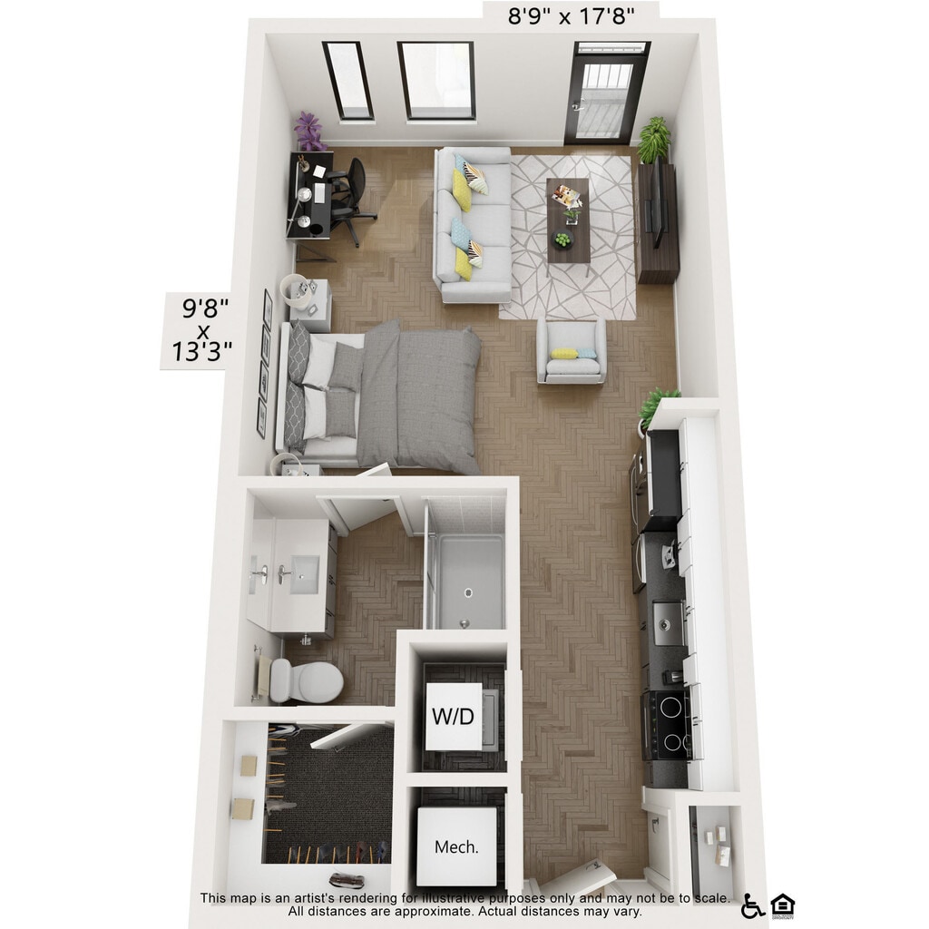 Apartment Model: S3From $1,619Studio, 1 Bath, 578 sq ftAvailable October 17, 2025Floor plans are artist's rendering. All dimensions are approximate. Actual product and specifications may vary in dimension or detail. Not all features are available in every rental home. Prices and availability are subject to change. Base rent is based on monthly frequency. Additional fees may apply, such as but not limited to package delivery, trash, water, amenities, etc. Deposits vary. Please see a representative for details.