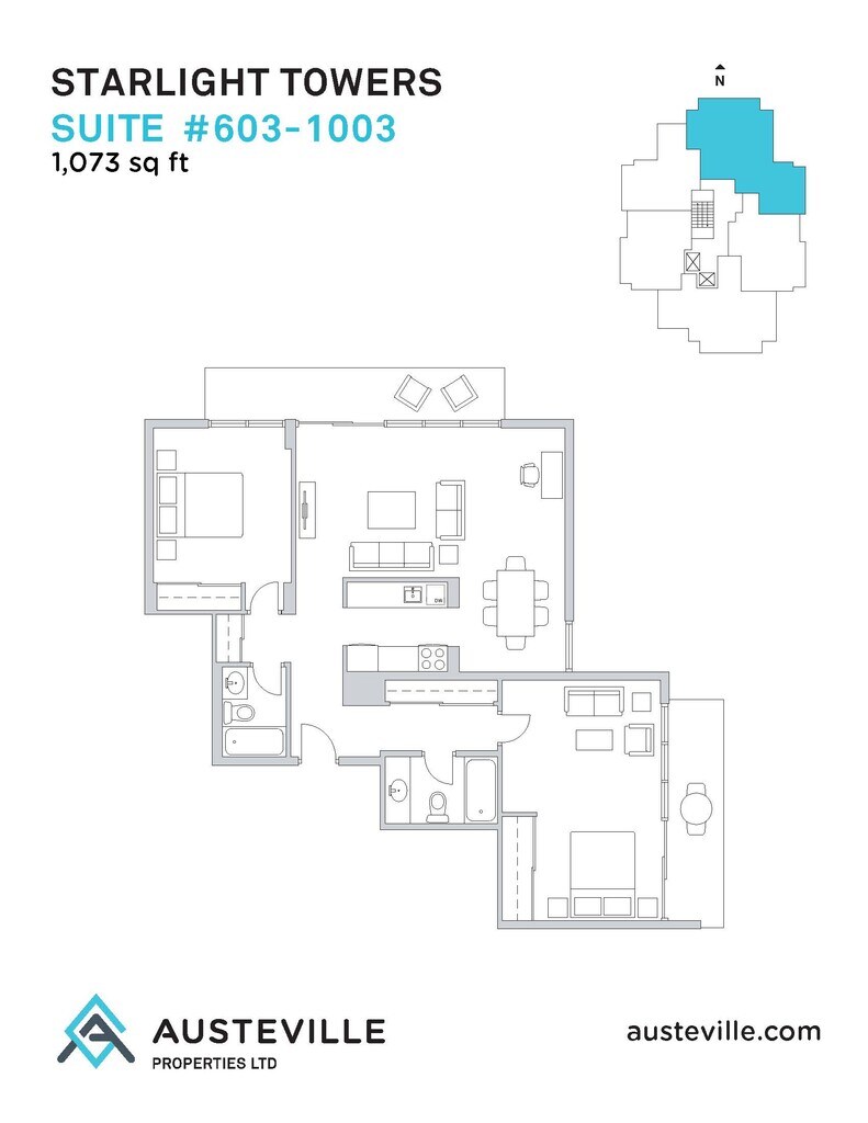2BD - Floorplan 3 Apartment Unit: 803Apartment Model: 2BD2 Bedroom, 1 Bath, 1073 sq ftAvailable NowPenthouse