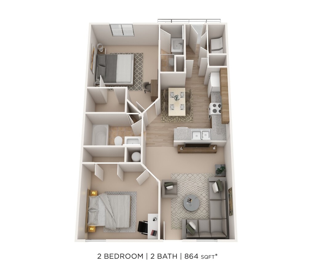 2 Beds, 2 Baths, 864 sq ftAvailable NowModel Gallery
