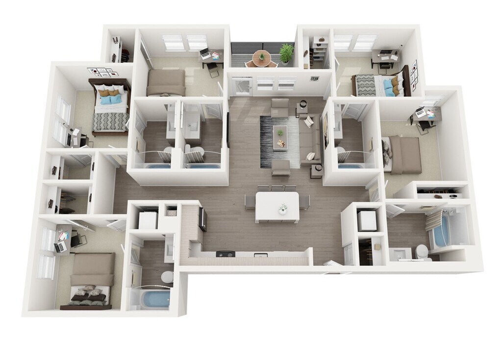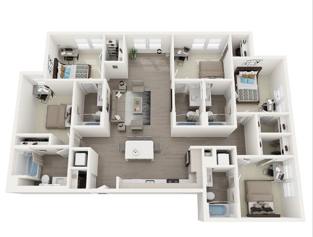 D1 - Floorplan 8 Apartment Unit: Pool ViewApartment Model: D14 Bedroom, 4 Bath, 1453 sq ftAvailable September 1, 2026Apartment Unit: Pool View MasterApartment Model: D14 Bedroom, 4 Bath, 1453 sq ftAvailable September 1, 2026Apartment Unit: TerraceApartment Model: D14 Bedroom, 4 Bath, 1453 sq ftAvailable September 1, 20265 Bedrooms