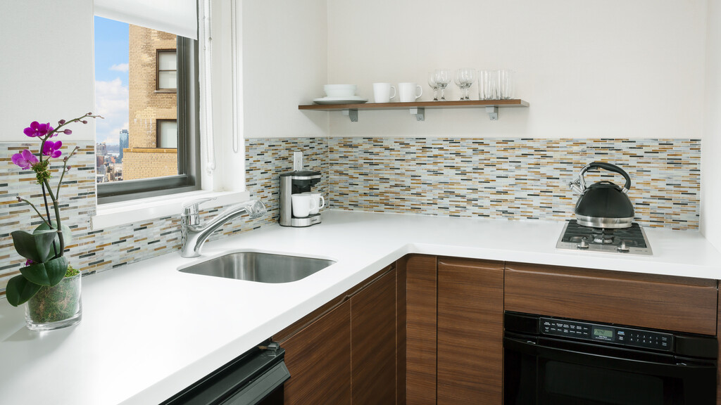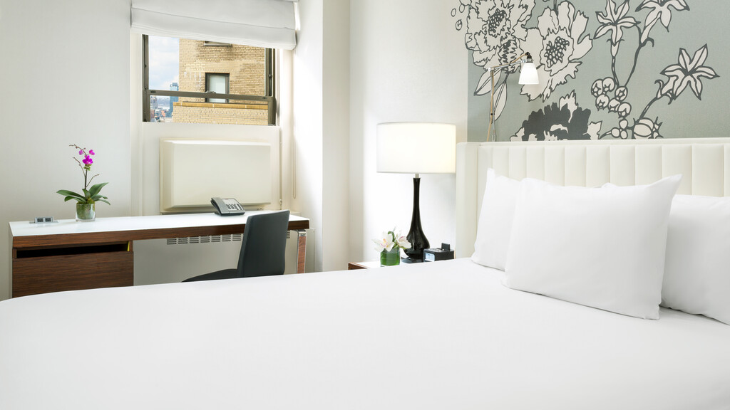 After a day of exploring Manhattan, relax in our 405-square-foot Studio Suite. Featuring a king or queen bed plus a sofa bed, a well-equipped kitchen with microwave, stovetop, and refrigerator, flat-screen TV, work space, and iHome docking station, this suite provides a restful retreat. Modern furnishings, clean lines, and a soothing palette make up our signature look. Max. 4 guests. Looking for apartment-style accommodations? Airy and spacious with a soothing palette, this 610-square-foot one-bedroom features one queen bed and a sofa bed; a well-equipped kitchen with microwave, stovetop, and refrigerator; work space; and a flat-screen TV in the living room. Move right in for a great trip to New York. Max. 4 guests.