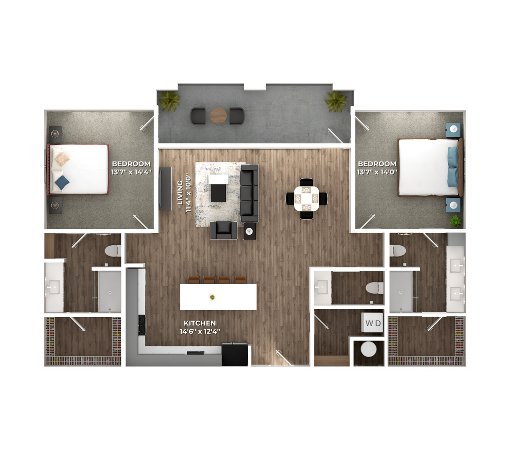 2 Beds, 2.5 Baths, 1438 sq ftLargest 2 BedroomThis is the largest 2 Bedroom at this PropertyModel Gallery