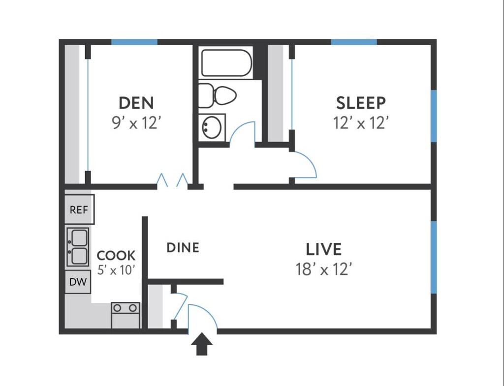 One Bedroom, One Bathroom - Floorplan 2 Apartment Unit: 08-10Apartment Model: One Bedroom, One BathroomFrom $1,2851 Bedroom, 1 Bath, 650 sq ftAvailable NowOne Bedroom, One Bathroom plus Den