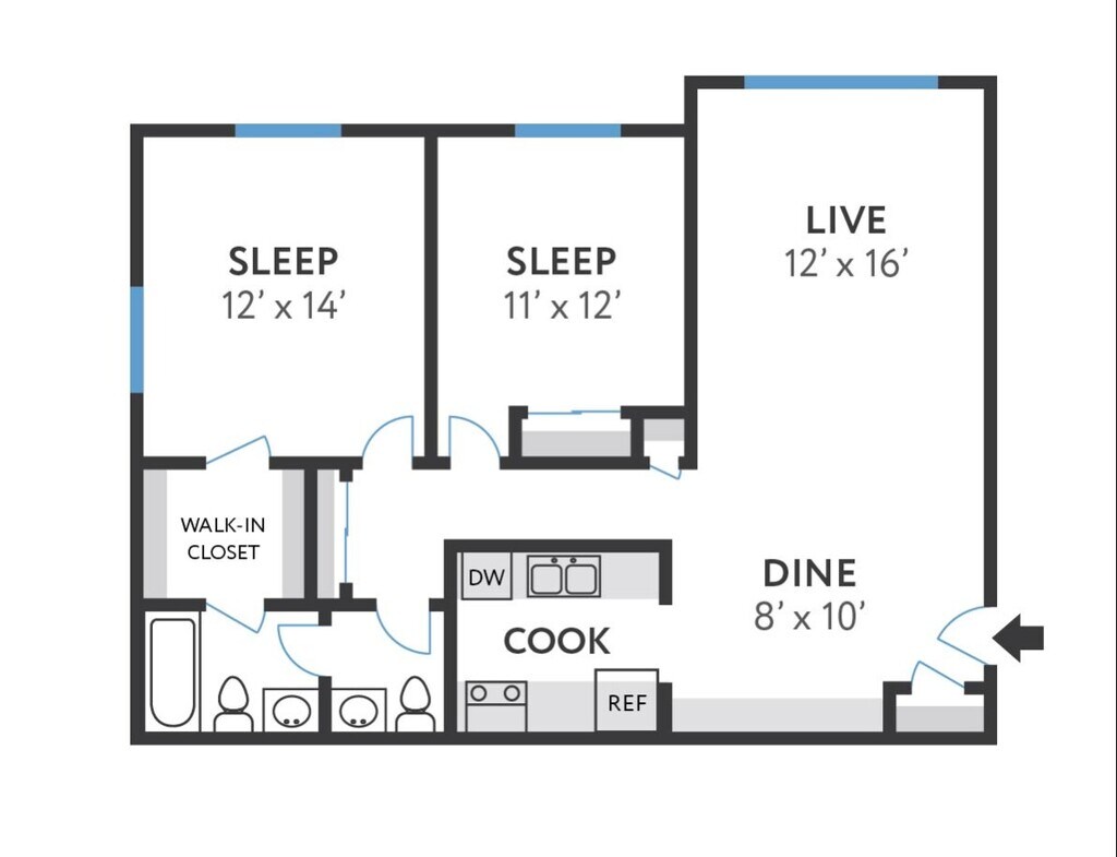 Apartment Model: Two Bedroom, One BathroomFrom $1,3952 Bedroom, 1 Bath, 760 sq ftUnavailable![]()