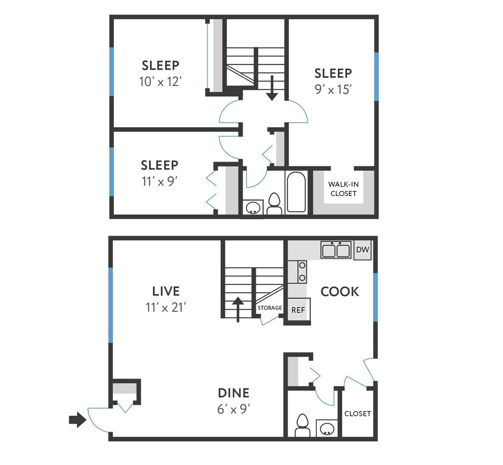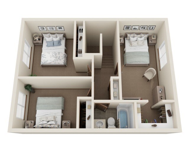 Apartment Model: Three Bedroom, One and a Half BathroomFrom $2,0953 Bedroom, 1.5 Bath, 1325-1566 sq ftUnavailableFloorplansPhotos![]()
