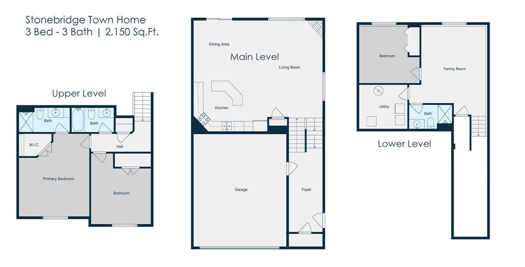 Stonebridge Town homes offer a spacious split-level design featuring 3 bedrooms and 3 bathrooms with over 2.000 sq. ft. of living space. The main level features an open-concept layout with vaulted ceiling, creating a bright and airy living space which includes a dining area, fireplace, and walk out deck. Downstairs, you'll find a family room, laundry space and the third bedroom. Upstairs, the large primary suite provides a private retreat, and there's plenty of storage throughout. Attached garage and central air for comfortable living in hot or cold weather. Stonebridge is a smoke-free, pet-friendly community—perfect for comfortable, modern living.
