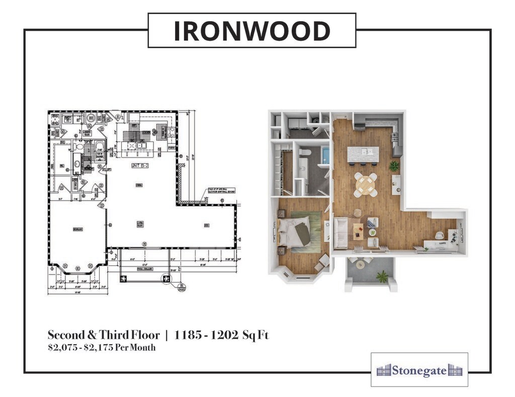 Apartment Model: IRONWOODFrom $2,0751 Bedroom, 1 Bath, 1185-1202 sq ftUnavailableIRONWOOD - Floorplan 1 SPRUCE