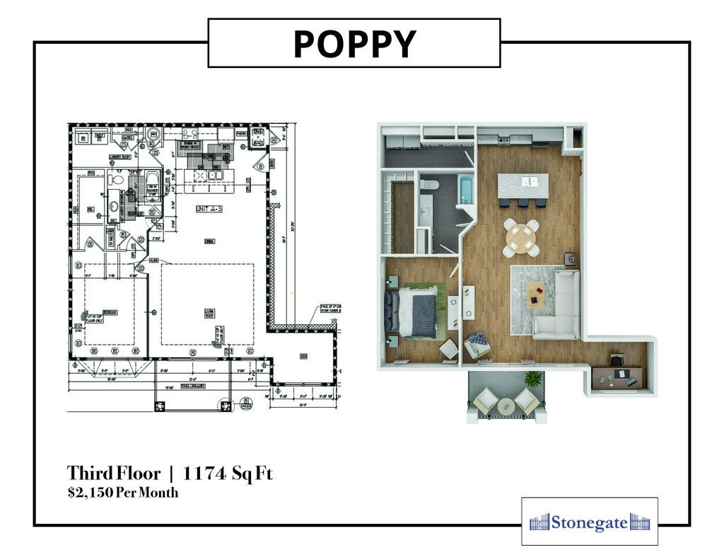 Apartment Model: POPPYFrom $2,1501 Bedroom, 1.5 Bath, 1174 sq ftUnavailablePOPPY - Floorplan 1 2 Bedrooms