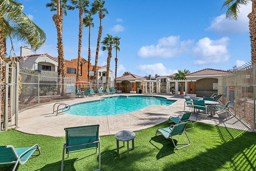 At Stonegate Apartments in East Las Vegas, we offer a wide range of amenities including 3 resort-style swimming pools, which provide the perfect opportunity to relax and unwind. The fitness center is fully equipped so you can maintain an active lifestyle. Additionally, we offer a dog park, a sports court, playground, clubhouse and community grills. Our on-site management team is friendly and dedicated to ensuring that residents have a comfortable and enjoyable living experience. They are available to assist with any questions or concerns that residents may have. Our 1 and 2 bedroom apartments are spacious and beautifully designed. Apartments feature a private patio or balcony and faux-wood floors that provide a modern and stylish look, while walk-in closets provide ample storage space. Select apartments feature stainless steel appliances, garden tubs and a washer and dryer. Come see all that Stonegate has to offer. Schedule your tour today!
