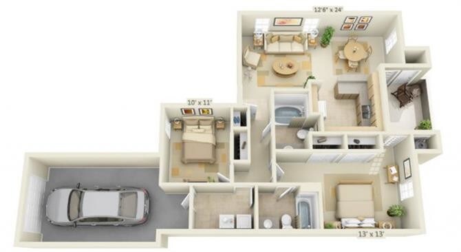 2 Beds, 2 Baths, 1077 sq ftAvailable NowLargest 2 BedroomThis is the largest 2 Bedroom at this PropertyModel Gallery