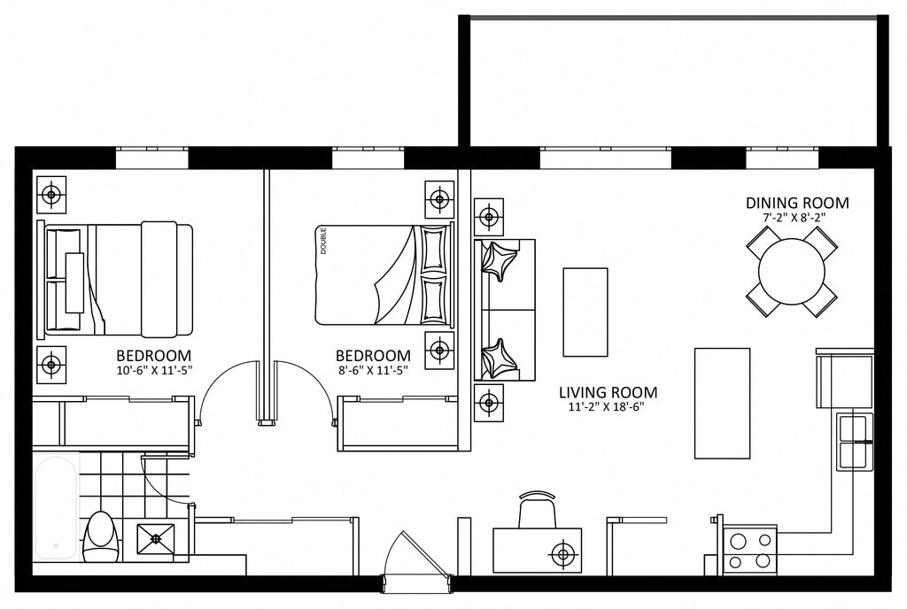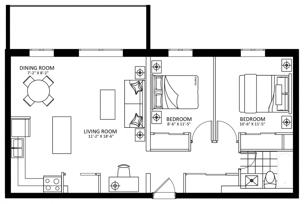 77 Delawana - Plan B - Floorplan Apartment Unit: 203Apartment Model: 77 Delawana - Plan B$1,8691 Bedroom, 1 Bath, 625 sq ftAvailable Now2 Bedrooms