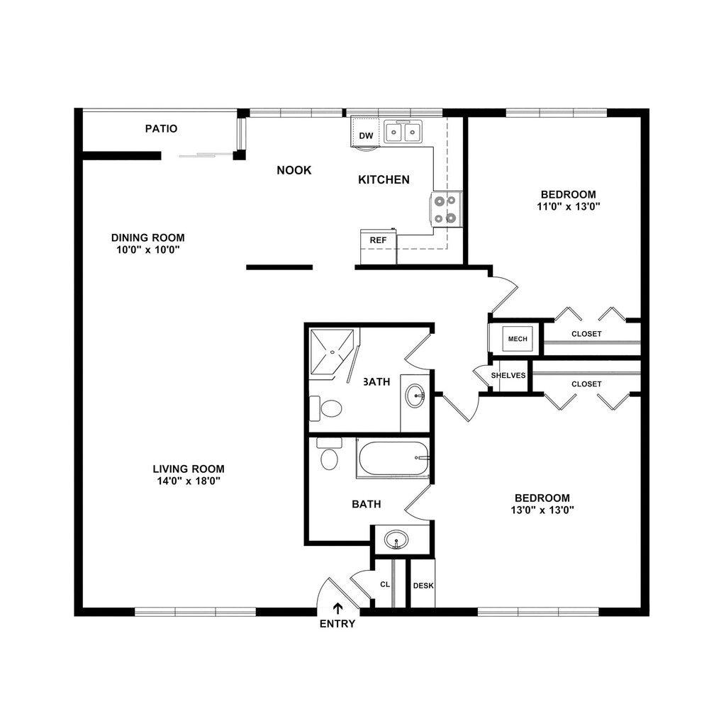 Two Bedroom 1.25 Bath - Floorplan 3 Apartment Unit: 132Apartment Model: Two Bedroom 1.25 Bath$2,0002 Bedroom, 1.25 Bath, 1024 sq ftAvailable NowTwo Bedroom