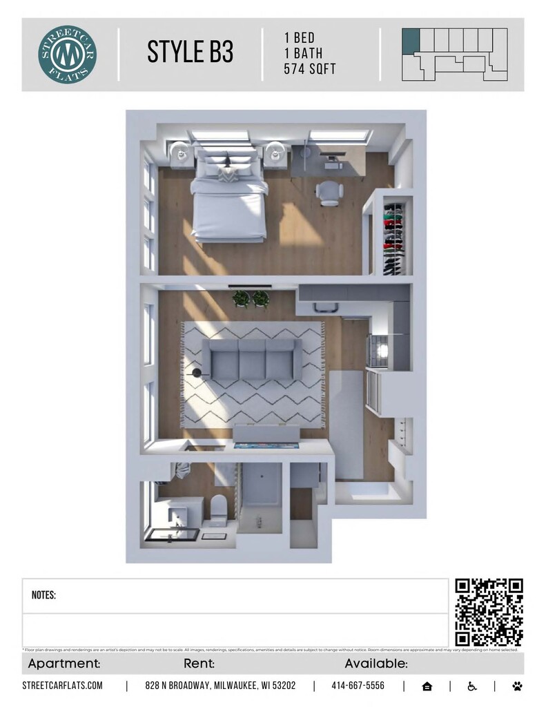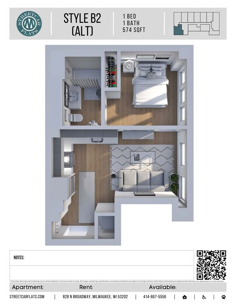 1 Bed, 1 Bath, 574 sq ftModel Gallery