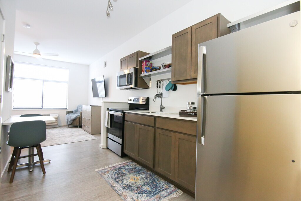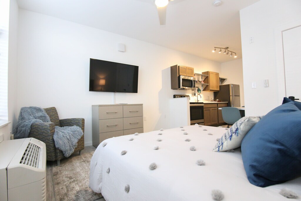 Our community is packed with modern common area amenities, and our units feature 9-foot ceilings, huge windows, stainless steel appliances, luxury vinyl plank flooring, sleek finishes, and efficient space design. We offer 2 sizes of studios, furnished and unfurnished, and all-inclusive pricing that covers utilities, wifi, cable, parking, and laundry. Our leasing options are designed to give residents the most responsive renting experience. We have both short-term and long-term leasing options available. Please contact our leasing office for more information. Have pets? We are pet-friendly! After an initial pet deposit, we do not charge any additional monthly pet rent—so spend it on them! Our full-service online portal allows residents to manage their experience 24 hours a day with the ability to pay online, request maintenance, and manage renters insurance Managed by Cowgill Inc. - We deliver valued resident experiences through exceptional service and reliable management.