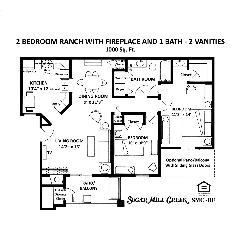 D-2 Bedroom Ranch w/ 1 Bath - Floorplan 1 DF-2 Bedroom/1Bath w/Fireplace