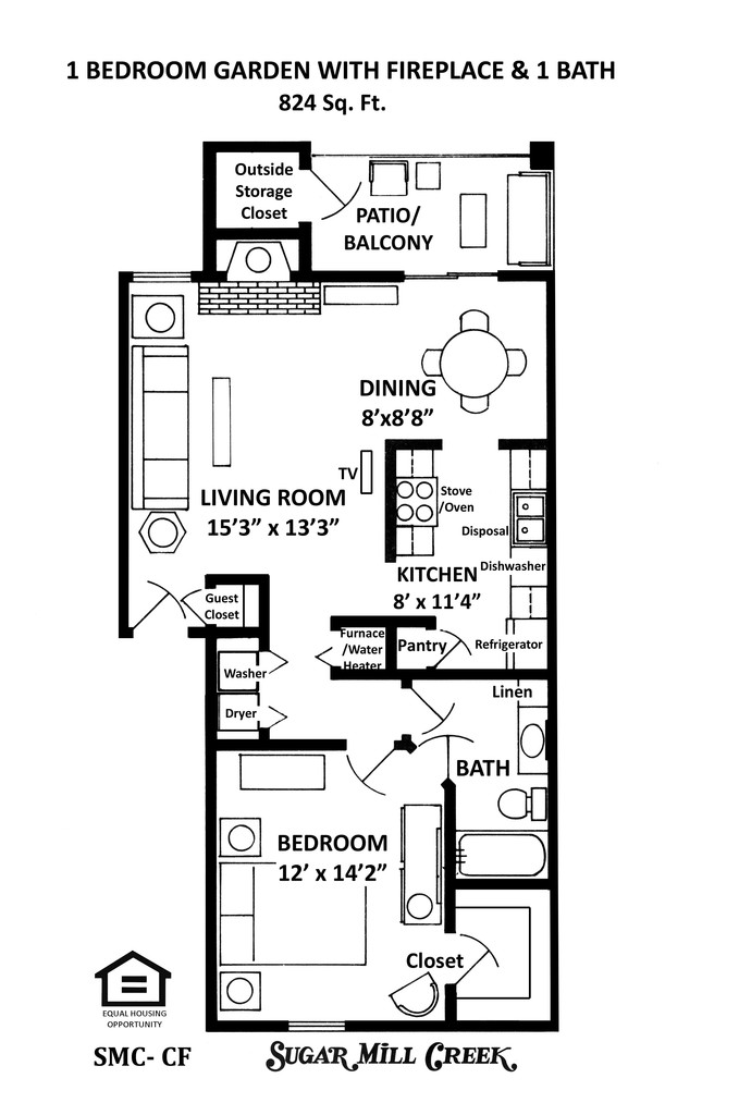 CF-1 Bedroom Garden w/Fireplace - Floorplan 1 BF-1 Bedroom/1 Bath w/Fireplace