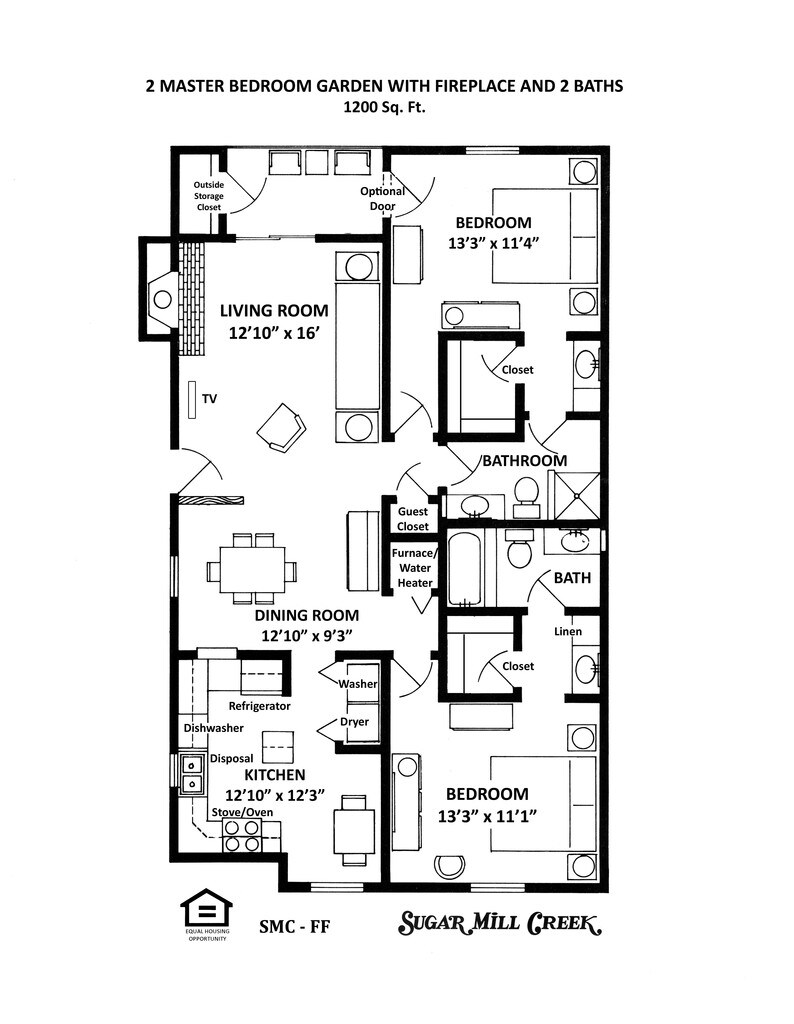 B-1 Bedroom Ranch w/ 1 Bath & 2 Vanities - Floorplan 1 CF-1 Bedroom Garden w/Fireplace