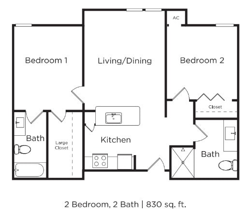 Apartment Model: 2x2$1,3002 Bedroom, 2 Bath, 830 sq ftAvailable NowFloorplansPhotos![]()