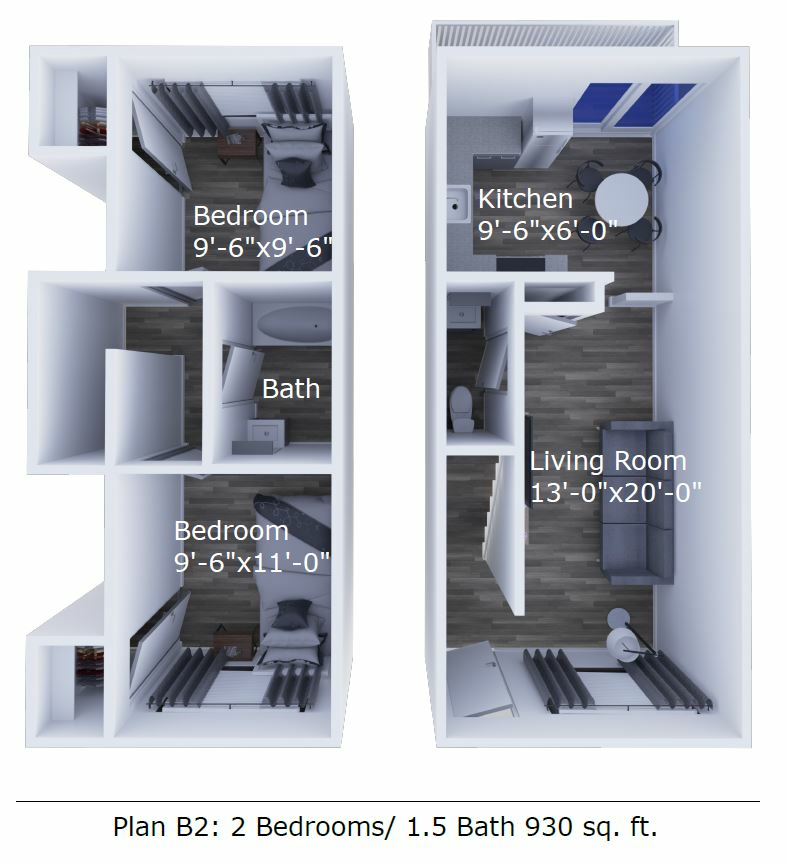 Two bed one and a half bath Townhome - Floorplan 1 Apartment Unit: 323Apartment Model: Two bed one and a half bath Townhome2 Bedroom, 1.5 Bath, 930 sq ftAvailable January 8, 2026Updated two bed one and a half bath Townhome