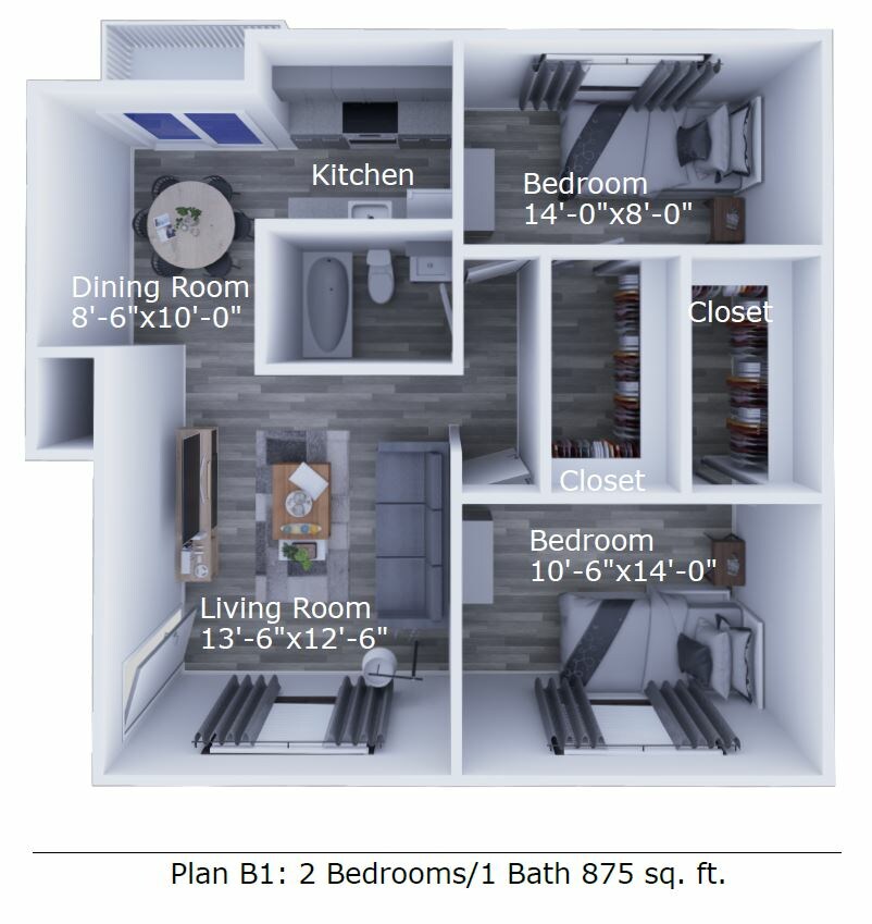 2 Beds, 1 Bath, 875 sq ftModel Gallery