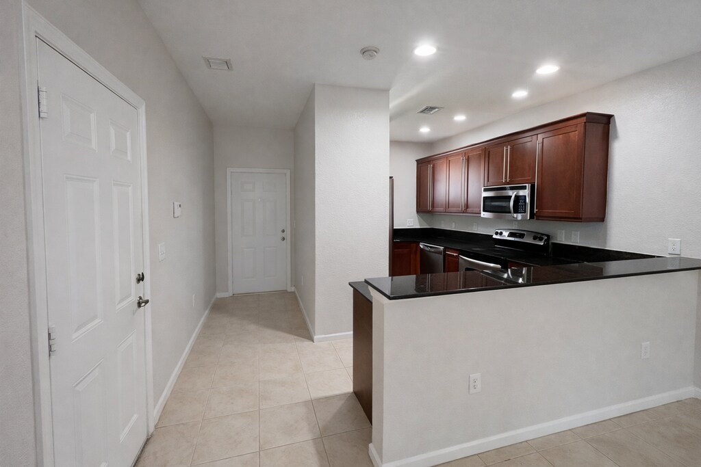 4 bedroom/3 bath Townhome in Gated Community - Unit has a front porch, first floor tiled and 2nd floor carpeted.One bedroom and connecting bathroom with shower on the 1st floor. Upgrades include stainless steel appliances, granite counter-tops, custom kitchen cabinetry, high ceilings, walk-in closet, hurricane impact windows. Master bathroom has extra large tub and separate shower. Laundry room conveniently located on 2nd floor of unit. Attached 1 car garage. Pest control, trash, are included in rent. Management is onsite. Community Pool. Professionally managed. Near Turnpike and 95.