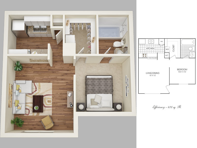 Studio, 1 Bath, 473 sq ftAvailable NowModel Gallery