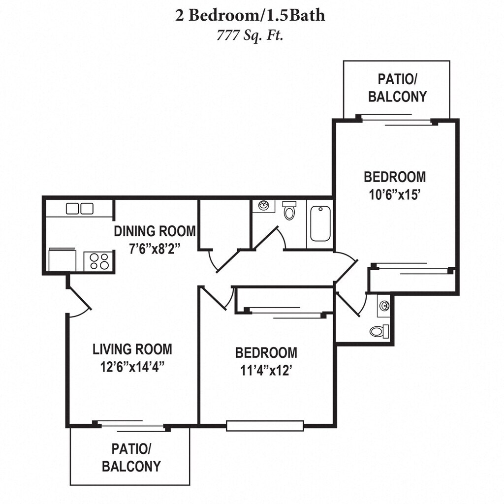 2 Bedrooms 1.5 Baths - 777SqFt - Floorplan 2 2 Bedrooms 1.5 Baths - 792SqFt