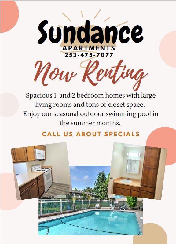 Welcome to the Sundance Apartments! We offer spacious one and two-bedroom homes with tons of closet space. Each home comes equipped with a full kitchen that includes a dishwasher. We are centrally located near the Lakewood Towne Centre. Hwy 512 and I5 are just a few short mins away. Clover Park Technical College is right around the corner and JBLM is only 15 minutes away!