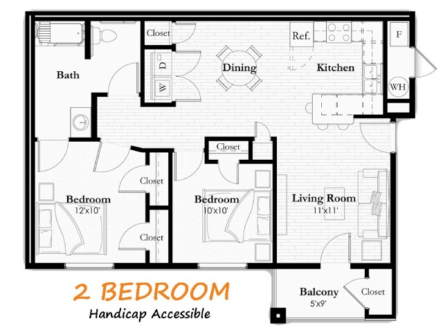 2 Bedroom, 1 Bath ADA - Floorplan 1 2 Bedroom, 2 Bath B