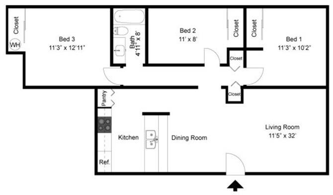 Availability Date Unit Sq Ft Unavailable Three Bedroom 976 sq ft Apartment Model: Three Bedroom3 Bedroom, 1 Bath, 976 sq ftUnavailable![]()