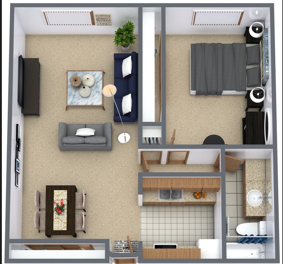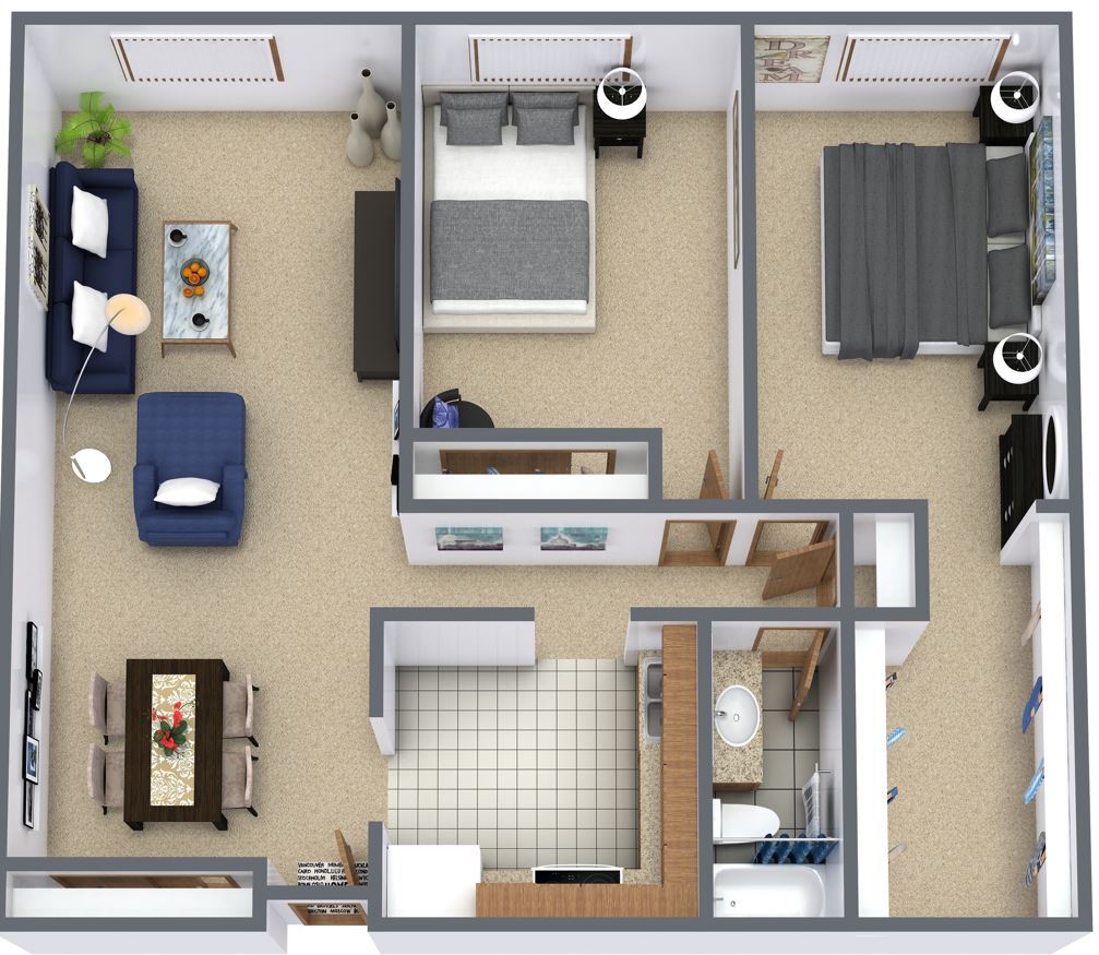 2 Beds, 1 Bath, 847 sq ftPlus FeesAvailable NowModel Gallery