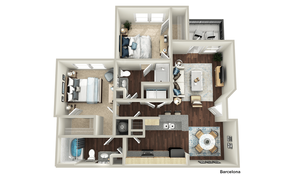 September 17, 2015It is a very room and stylish apartment. Big kitchen and good appliances. Ceiling fans that keep the areas cool and comfortable. Big soaker tub inone bathroom and good sized shower in the other. Balcony that fits a table and 2 chairs with extra room to decorate. Some amenities are a cardio room and a weight room beautiful clubhouse and outdoor living space with bbqs and a salt water pool that goes up to 4 feet.Review from Apartments.com