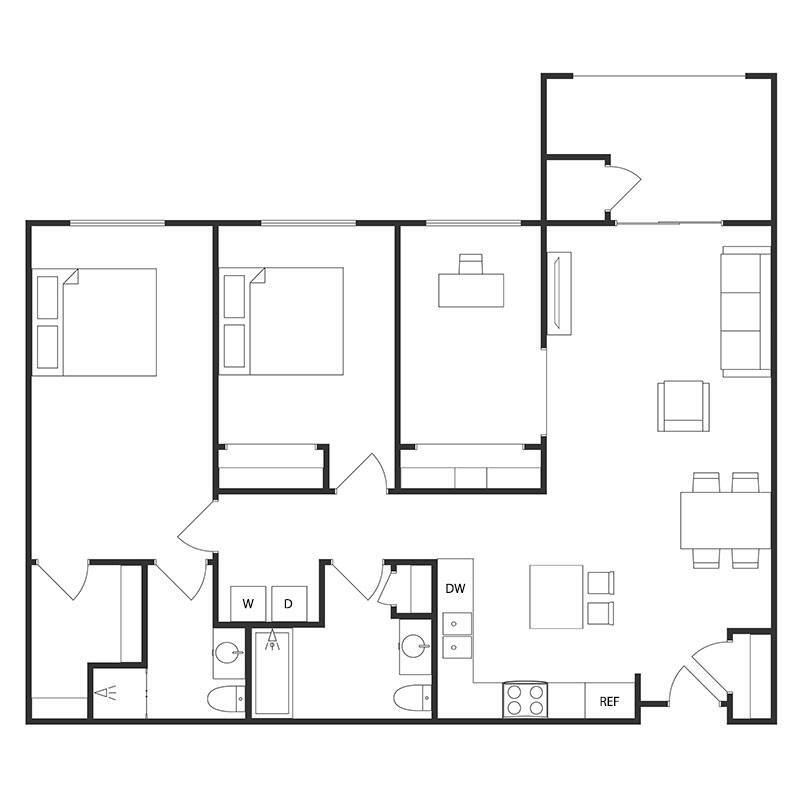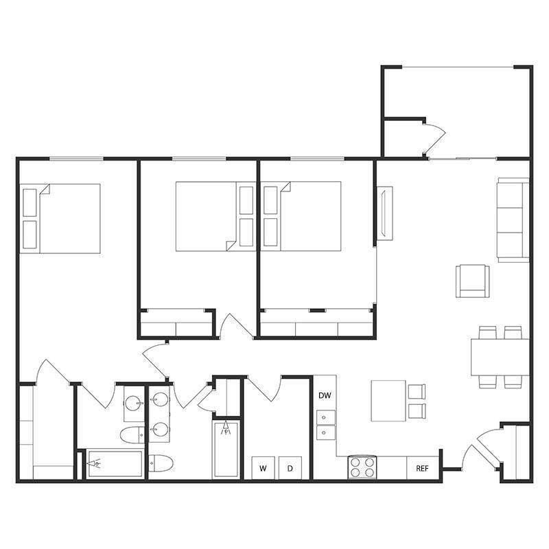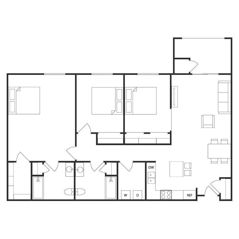 Apartment Model: 3 BED 2 BATHFrom $1,1593 Bedroom, 2 Bath, 1230-1377 sq ftUnavailable![]()