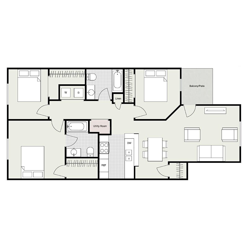 Availability Date Unit Sq Ft Deposit Unavailable Four Bedrooms Two Bathrooms 1215-1338 sq ft $500 Apartment Model: Four Bedrooms Two Bathrooms4 Bedroom, 2 Bath, 1215-1338 sq ftUnavailable![]()