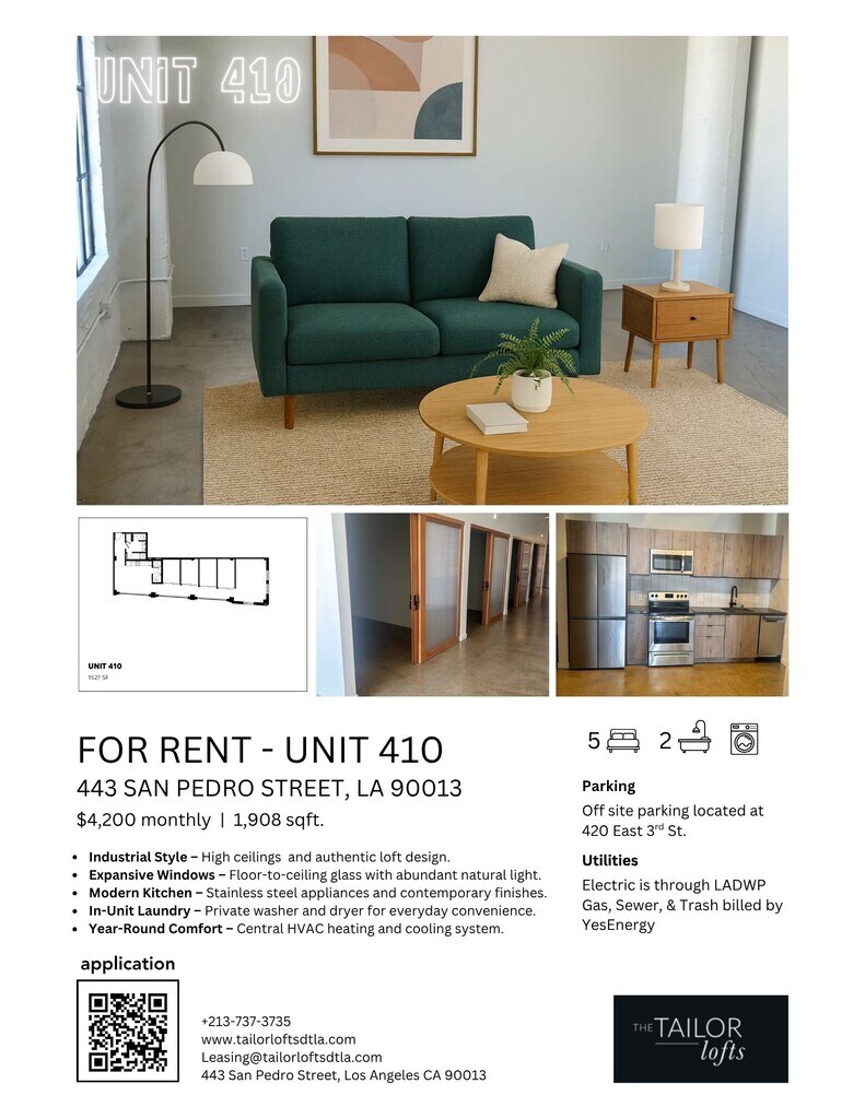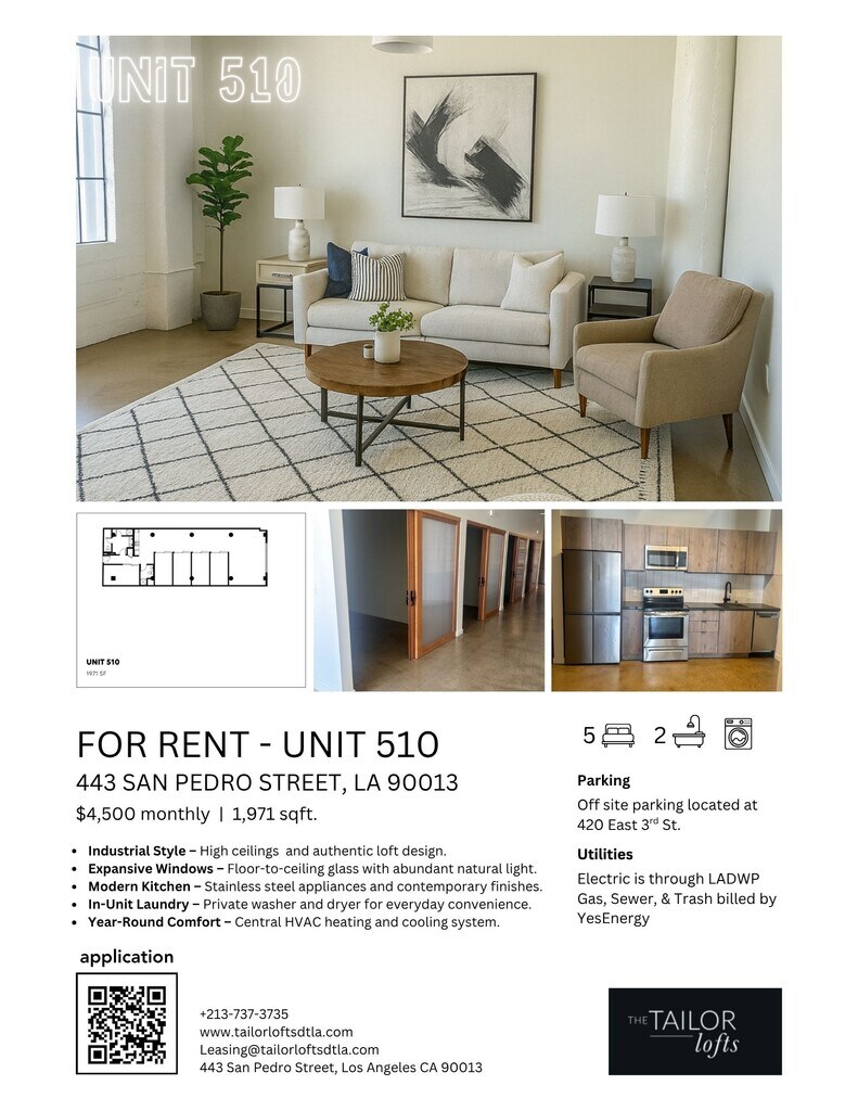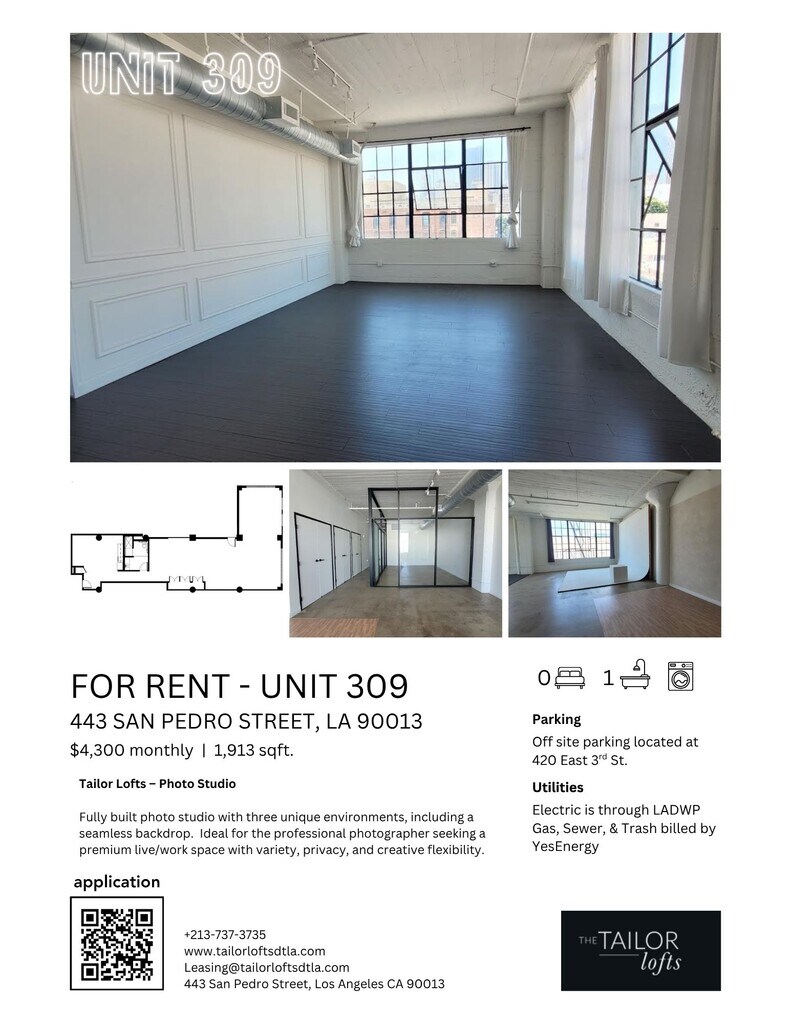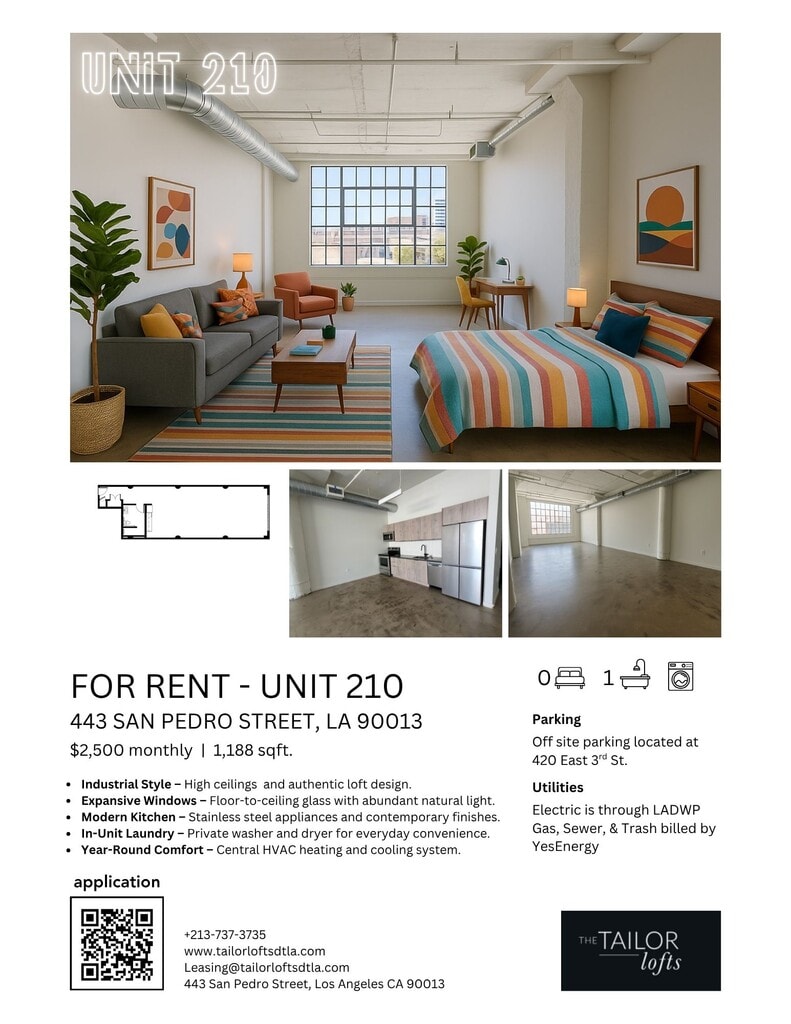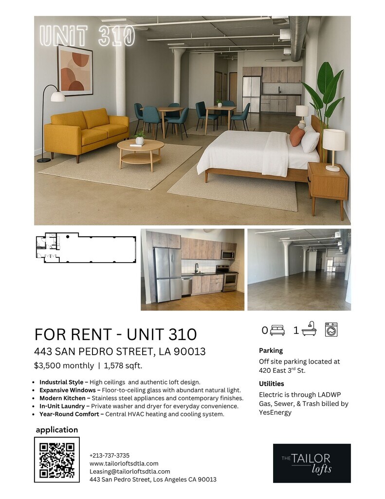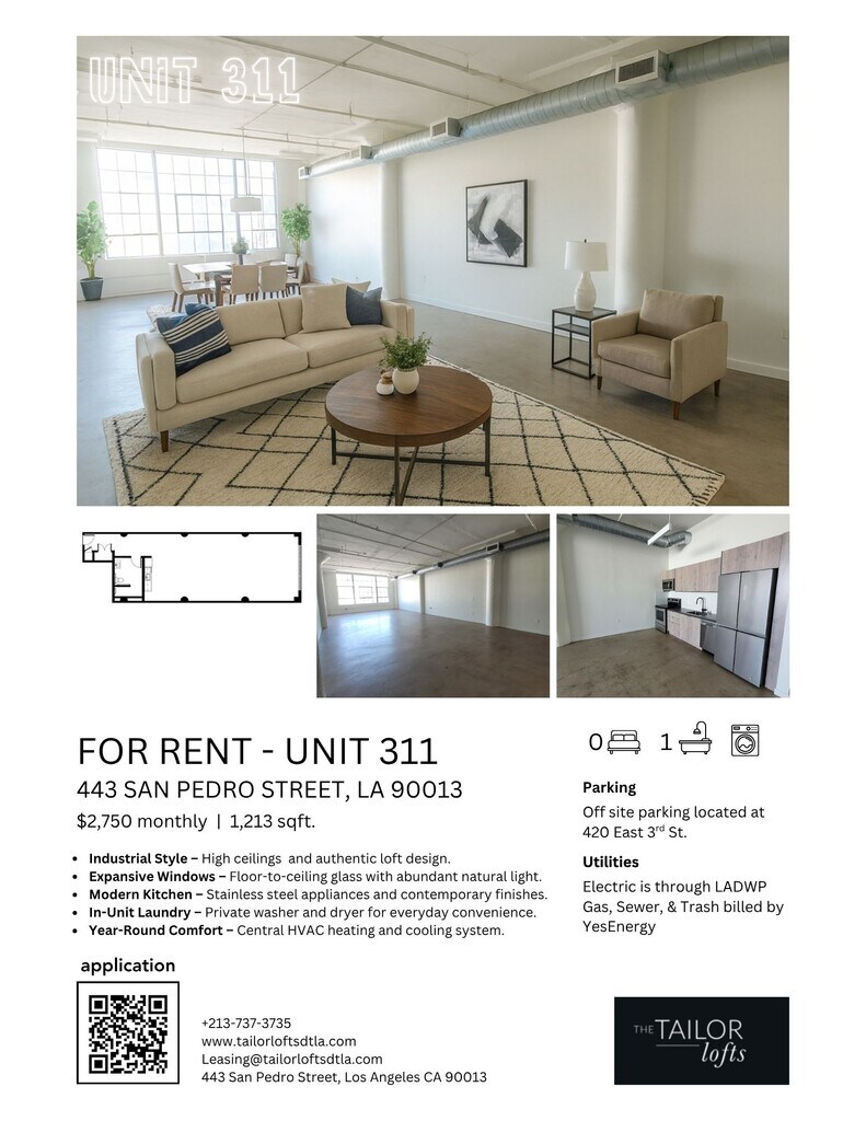 Tailor Lofts is located in Downtown Los Angeles historic Toy District, between 5th Street and San Pedro. The property was originally built in 1923, but as of 2019 is a completely renovated and reinvented 58-unit, mixed-use building consisting of work lofts, commercial lofts, live lofts, and retail. In-unit amenities will include in-unit washers and dryers, brand new and fully-equipped kitchens, central air conditioning and heat, and spacious units with functional layouts. On-site amenities include full-service management, fitness center, rooftop terrace equipped with barbecues, lounge areas, and amazing city views.*Floor plan prices listed are market base rents with no additional fees included. For a better understanding of a total monthly rent and possible additional fees, please ask office personnel for further details.*