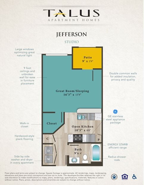 Price Availability Date Unit Sq Ft $1,240 Call for Availability Jefferson 513 sq ft Model Amenities and Features